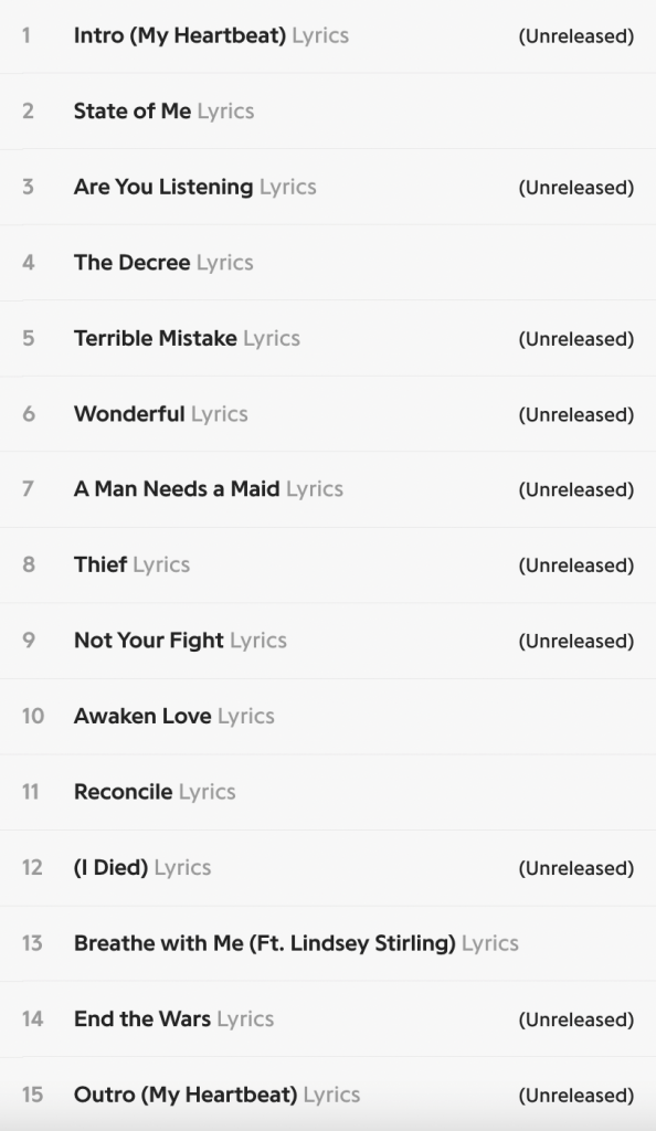 The intro and outro will probably be brief, with “(I Died)” serving as an interlude and “A Man Needs a Maid” possibly being a spoken word piece (similar to “Vanity” from Life Screams). (Just a hunch—this title stands out the most among the others, so I find it hard to imagine it as a full-length song. I’m curious what the message will be!)